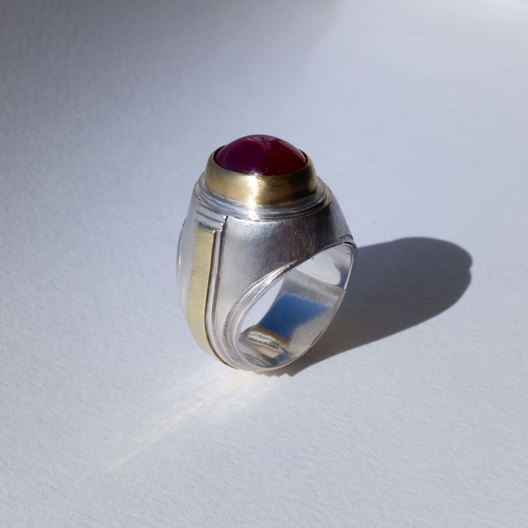 Silver, gold, onyx, carnelian, steel pin (2018)